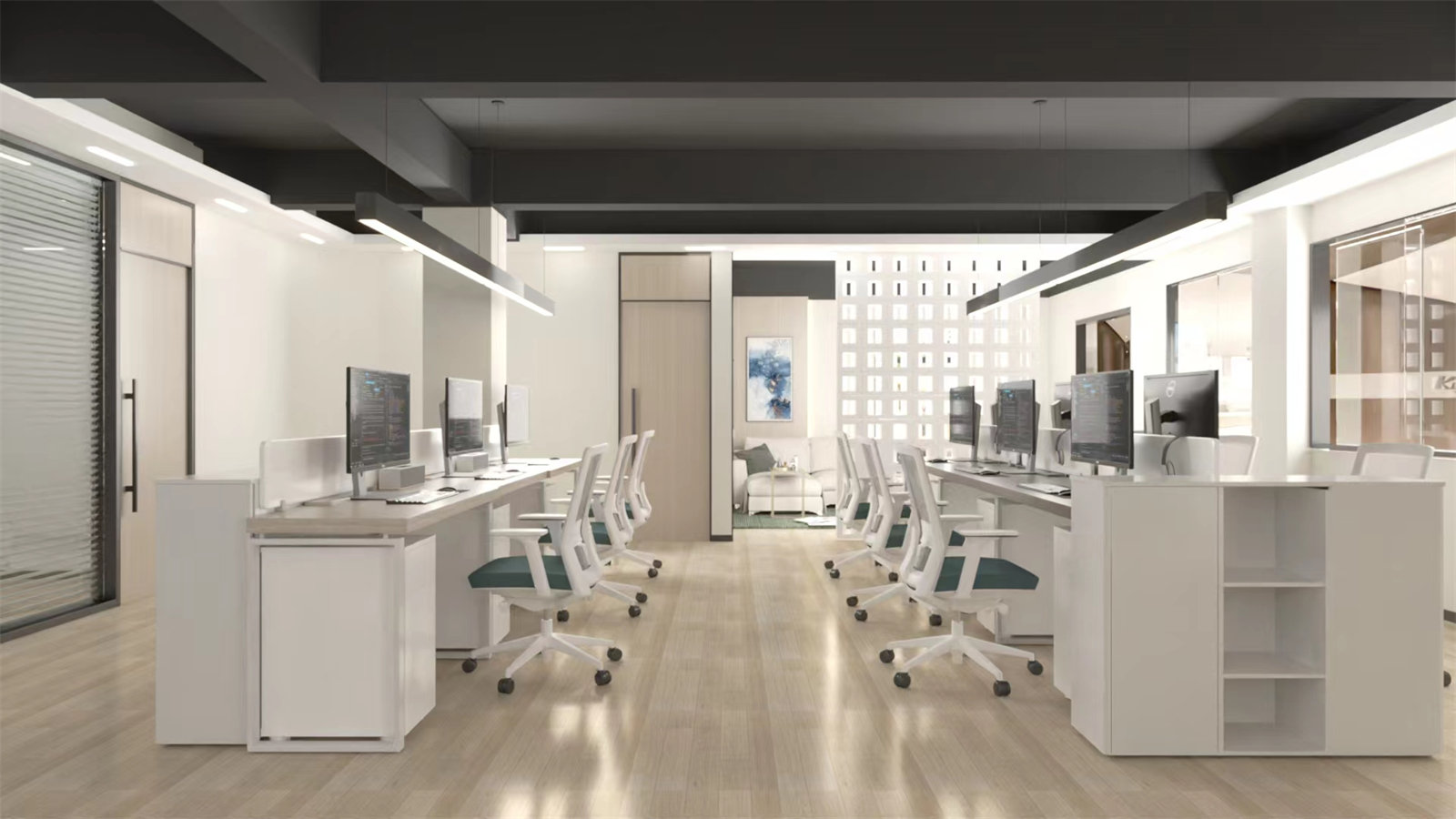 設(she)計(ji)理念(nian):本項目(mu)設(she)計(ji)風格(ge)簡約而時(shi)尚,創造一個(ge)高(gao)效、舒適和(he)(he)美觀的工(gong)作(zuo)環境,滿足員工(gong)的需求并促進團隊合(he)作(zuo)。空間布(bu)局(ju)合(he)理,工(gong)作(zuo)區域寬(kuan)敞明亮(liang),每個(ge)工(gong)位都(dou)有(you)足夠的工(gong)作(zuo)空間。其次,色(se)(se)彩搭配(pei)非常和(he)(he)諧,以白色(se)(se)和(he)(he)淺灰色(se)(se)為主色(se)(se)調,營(ying)造出一種平靜而專業(ye)的氛圍。此(ci)外,設(she)計(ji)師巧妙(miao)地(di)使用了黑色(se)(se)線(xian)條和(he)(he)深色(se)(se)地(di)板來增加空間的層次感(gan)和(he)(he)深度。