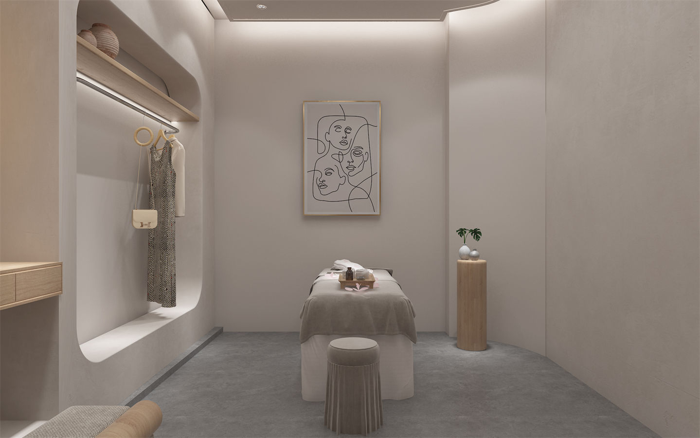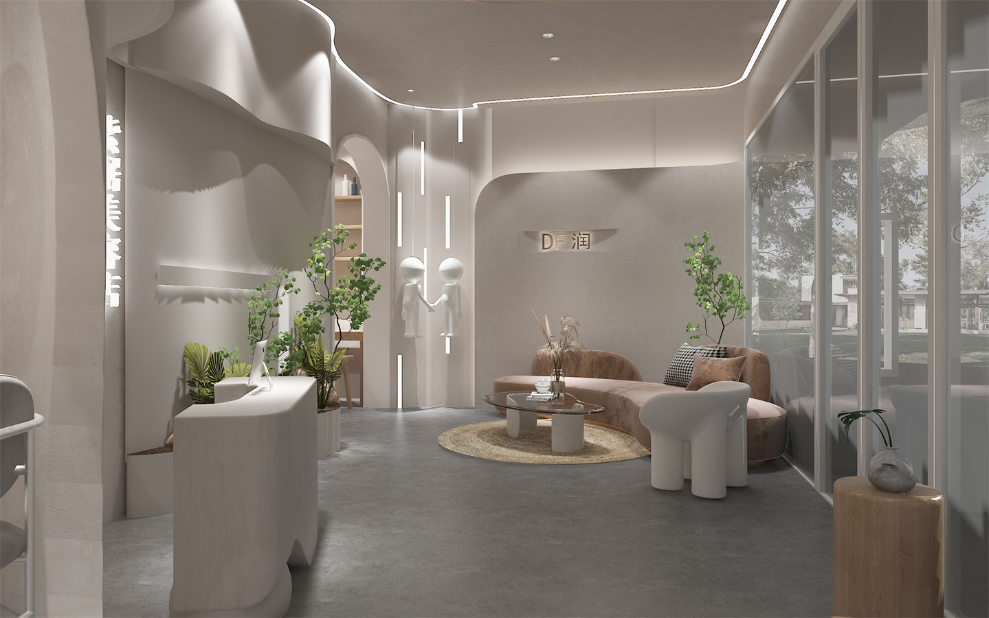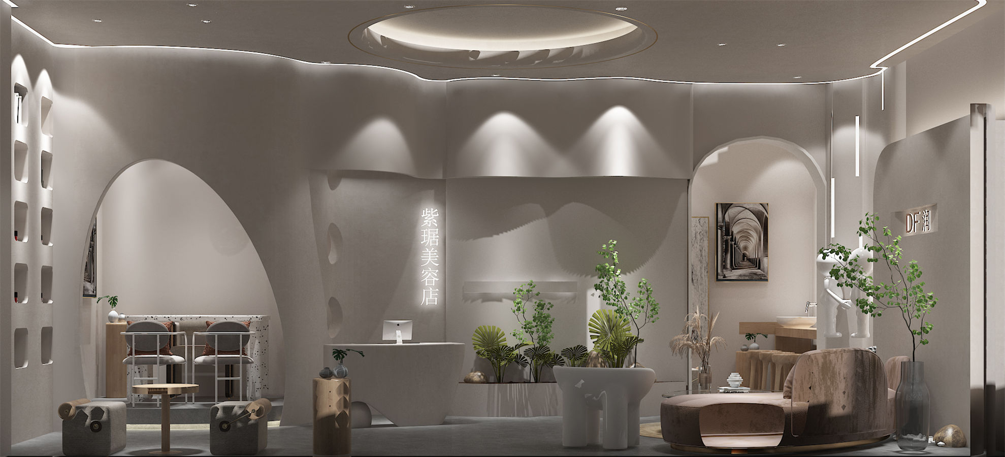 設(she)計(ji)(ji)理念:本項目(mu)美容(rong)院設(she)計(ji)(ji)以(yi)現代簡(jian)約風格為主,強調空(kong)(kong)間的舒適性和(he)實用(yong)性。設(she)計(ji)(ji)師運(yun)用(yong)了大量(liang)的弧形元素,如拱門、圓(yuan)形天花板和(he)曲線家具(ju),營造(zao)出柔(rou)和(he)而(er)流(liu)暢的空(kong)(kong)間氛(fen)圍。設(she)計(ji)(ji)師充分(fen)考慮了人(ren)(ren)流(liu)動線和(he)使用(yong)需(xu)求。前臺區(qu)域(yu)設(she)置在入口(kou)處方便接待客人(ren)(ren);休(xiu)息區(qu)則(ze)位(wei)于(yu)中央(yang)位(wei)置,便于(yu)顧客交流(liu)互動;而(er)植物擺放則(ze)分(fen)散于(yu)各(ge)角(jiao)落,既美化(hua)環境又起到(dao)分(fen)隔空(kong)(kong)間的作用(yong)。