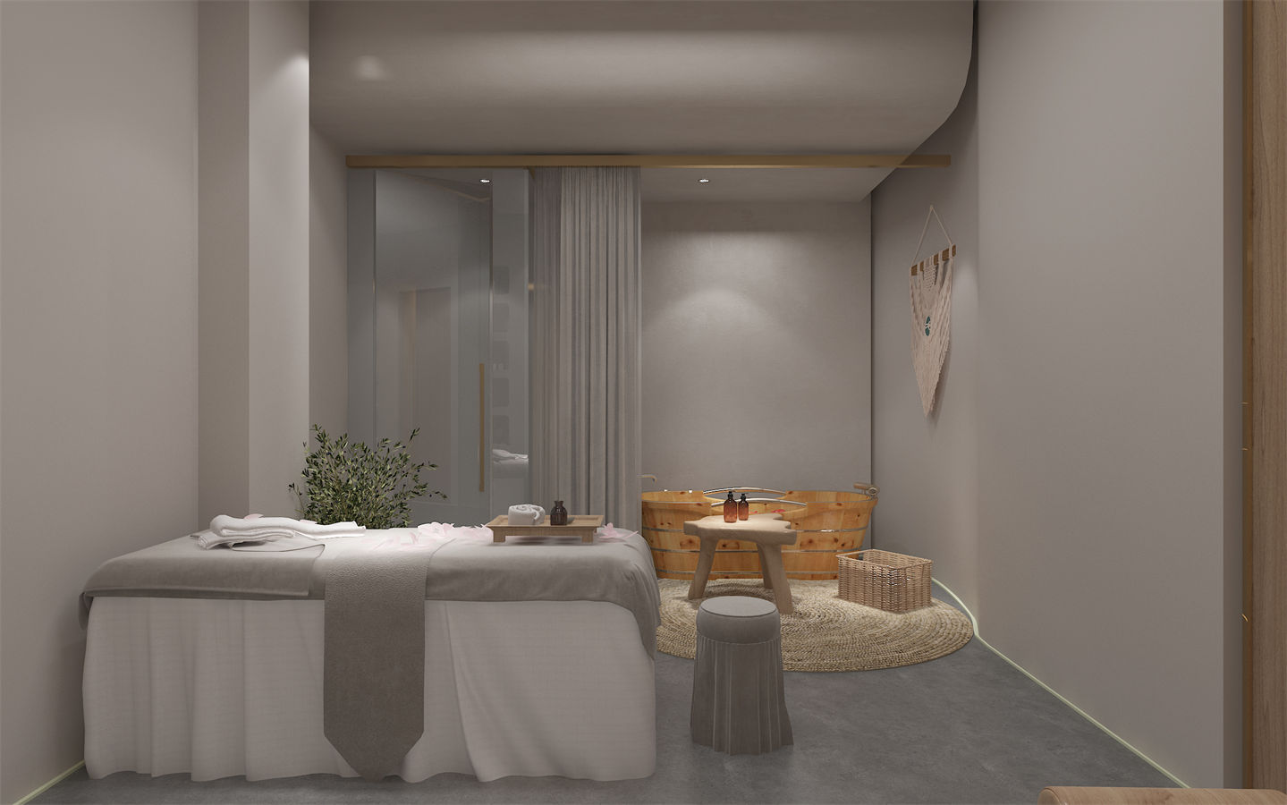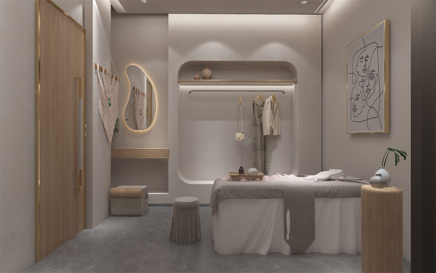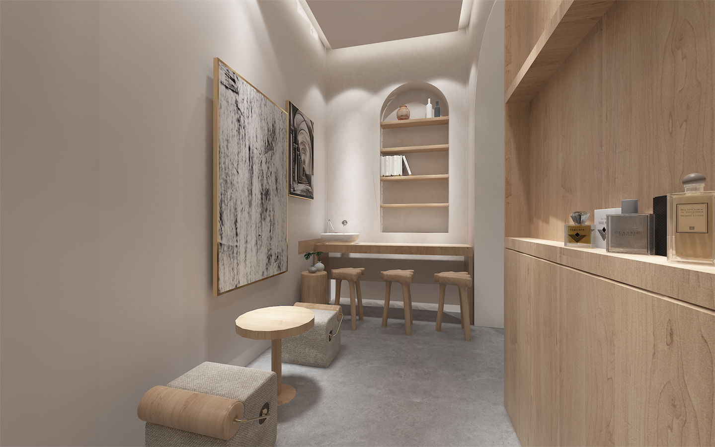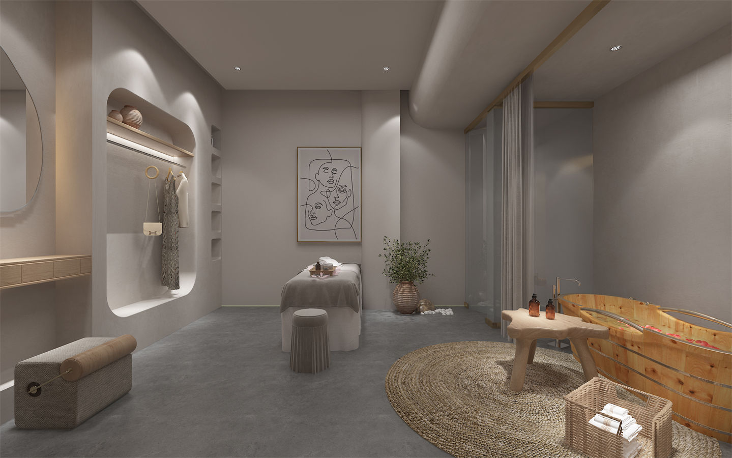 設(she)計(ji)(ji)理念:本項目(mu)美容(rong)院設(she)計(ji)(ji)以(yi)現代簡(jian)約風格為主,強調空(kong)(kong)間的舒適性和(he)實用(yong)性。設(she)計(ji)(ji)師運(yun)用(yong)了大量(liang)的弧形元素,如拱門、圓(yuan)形天花板和(he)曲線家具(ju),營造(zao)出柔(rou)和(he)而(er)流(liu)暢的空(kong)(kong)間氛(fen)圍。設(she)計(ji)(ji)師充分(fen)考慮了人(ren)(ren)流(liu)動線和(he)使用(yong)需(xu)求。前臺區(qu)域(yu)設(she)置在入口(kou)處方便接待客人(ren)(ren);休(xiu)息區(qu)則(ze)位(wei)于(yu)中央(yang)位(wei)置,便于(yu)顧客交流(liu)互動;而(er)植物擺放則(ze)分(fen)散于(yu)各(ge)角(jiao)落,既美化(hua)環境又起到(dao)分(fen)隔空(kong)(kong)間的作用(yong)。