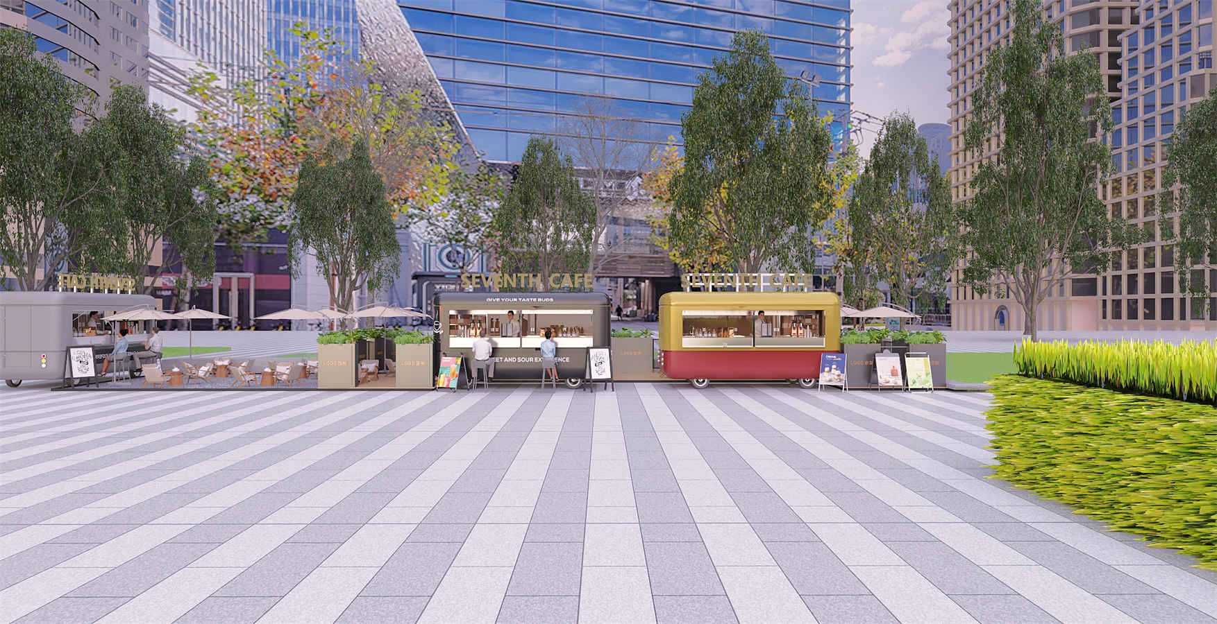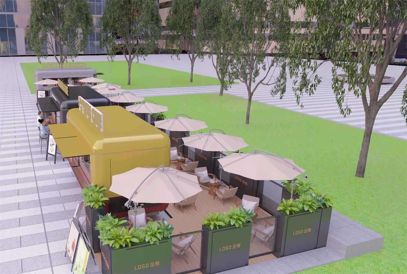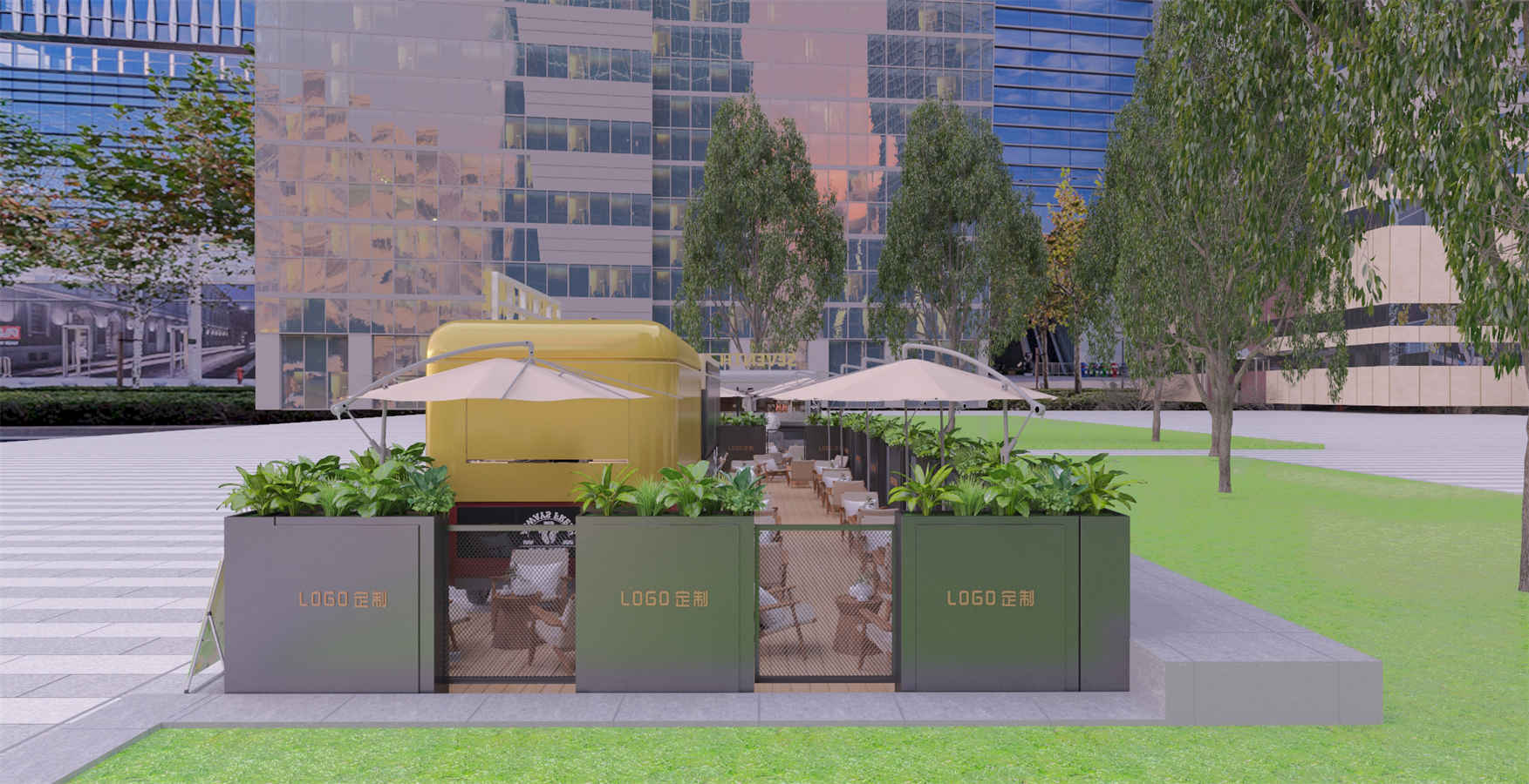 設(she)計理(li)(li)念(nian):本項目設(she)計理(li)(li)念(nian)是(shi)將戶外廣(guang)場(chang)與(yu)移動咖啡車相結合(he),創造一個輕松愉快(kuai)的(de)社(she)交(jiao)場(chang)所。通過使用(yong)鮮(xian)艷的(de)顏(yan)色和現(xian)代材料,如金屬和玻璃,使得整(zheng)個場(chang)景充滿(man)活(huo)力和時(shi)尚感。同(tong)(tong)時(shi),利(li)用(yong)綠植(zhi)和樹(shu)木(mu)來增加自然元素,使得人們在享受(shou)城市(shi)生活(huo)的(de)同(tong)(tong)時(shi)也能(neng)(neng)感受(shou)到大自然的(de)氣息。此外,設(she)計還考慮到功能(neng)(neng)性需求,如遮(zhe)陽傘和座椅等設(she)施提(ti)供了(le)便利(li)和舒適性。整(zheng)體上,這種設(she)計旨在提(ti)供一個既美觀又實用(yong)的(de)空間,滿(man)足人們對(dui)于品質生活(huo)的(de)需求。
