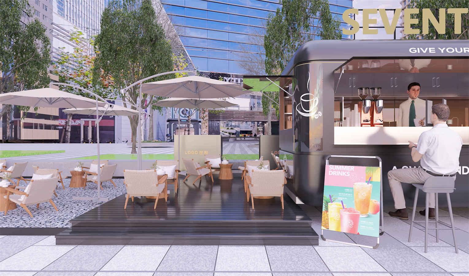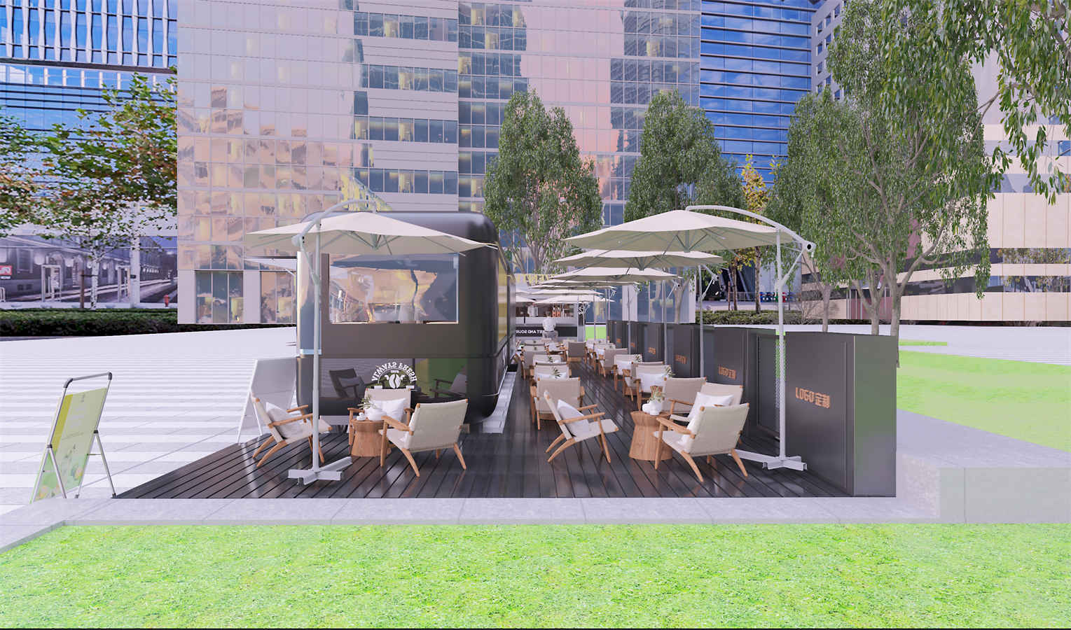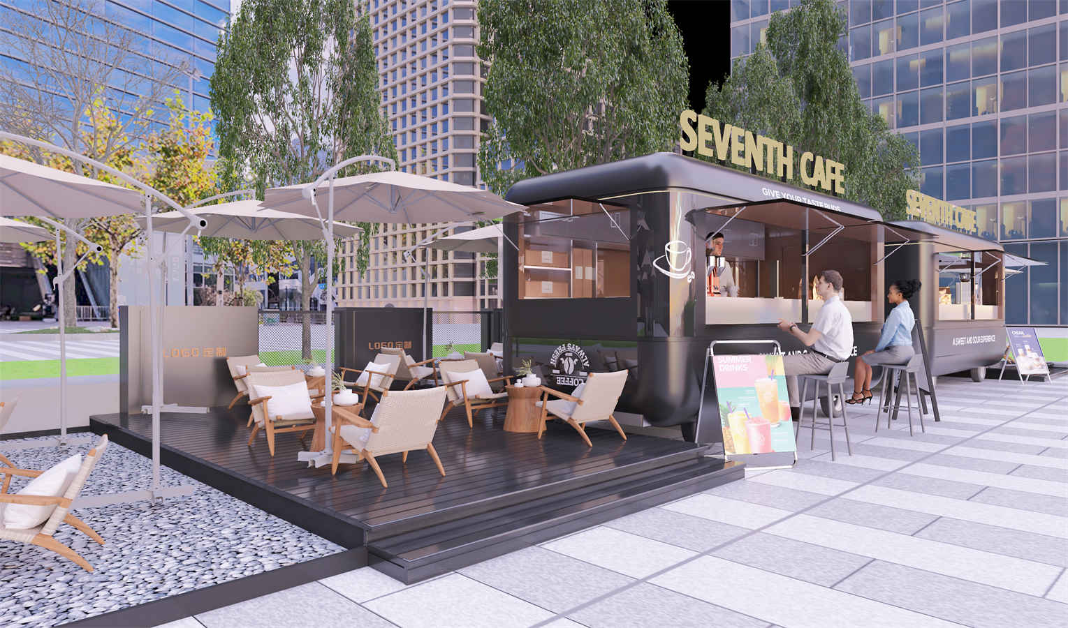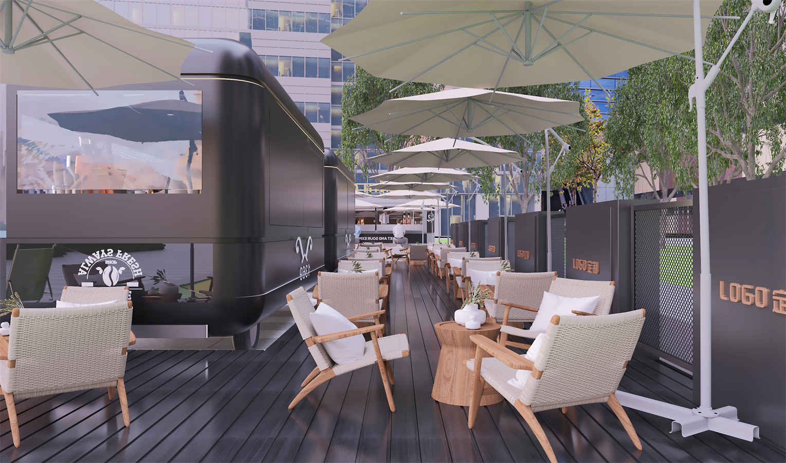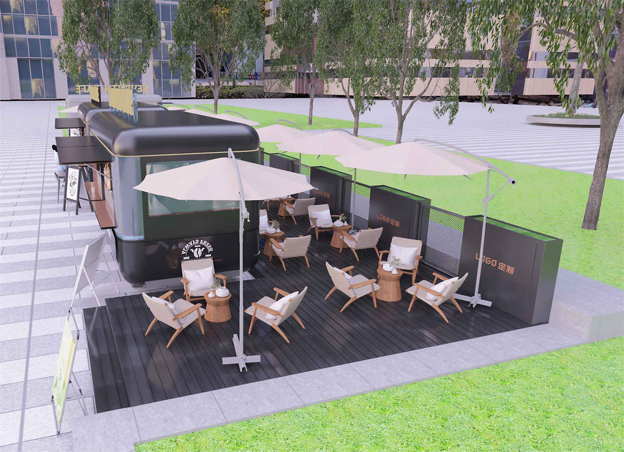 設(she)(she)計理(li)(li)(li)(li)念:本項目設(she)(she)計理(li)(li)(li)(li)念旨在創造一個舒適、休閑和(he)(he)具有現(xian)代感(gan)的(de)(de)(de)(de)公共空間。黑色(se)的(de)(de)(de)(de)主色(se)調搭配米色(se)的(de)(de)(de)(de)座椅和(he)(he)遮陽傘(san),營造出(chu)優雅(ya)且和(he)(he)諧的(de)(de)(de)(de)氛圍。木質(zhi)的(de)(de)(de)(de)桌椅和(he)(he)地板傳達出(chu)溫暖(nuan)和(he)(he)自然的(de)(de)(de)(de)感(gan)覺,與周圍的(de)(de)(de)(de)綠色(se)植物(wu)相得(de)益彰(zhang)。整個設(she)(she)計注重(zhong)細節處理(li)(li)(li)(li),如白色(se)線條(tiao)的(de)(de)(de)(de)勾勒(le)增加了建(jian)筑(zhu)的(de)(de)(de)(de)層次感(gan)和(he)(he)立體感(gan)。此(ci)外,考慮到實際需求,設(she)(she)計中還包含了可定制的(de)(de)(de)(de)品(pin)牌標(biao)識,為企業提(ti)供(gong)了品(pin)牌推廣的(de)(de)(de)(de)機會。整體上,這個設(she)(she)計結(jie)合(he)了現(xian)代美學、舒適度以(yi)及品(pin)牌融入,為消費者(zhe)提(ti)供(gong)了一個理(li)(li)(li)(li)想的(de)(de)(de)(de)放松和(he)(he)社交場所。